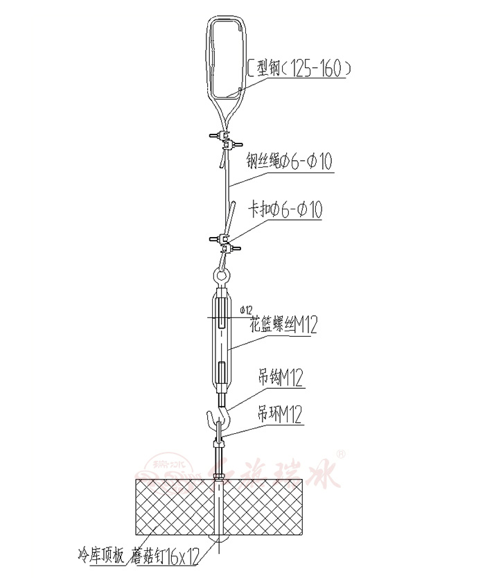 裝配:吊頂方式主要通過鋼筋棍實現(xiàn),蘑菇釘穿過頂板與吊環(huán)連接,吊環(huán)掛在花籃螺絲上,鋼筋棍與花籃和脹管相連。吊頂方式通過花籃調節(jié)從而控制吊頂?shù)木嚯x。